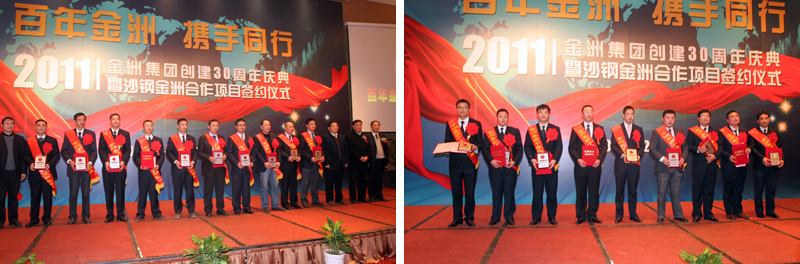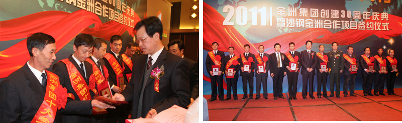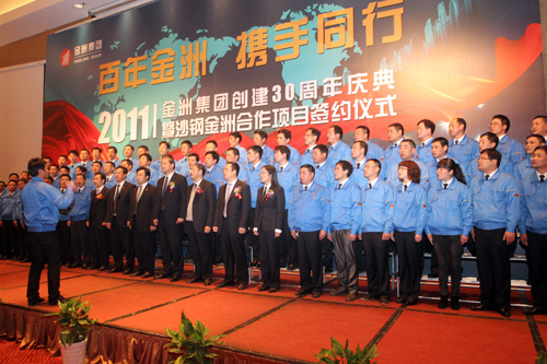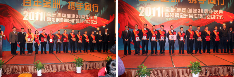 2011年12月20日下午,金洲集團(tuán)創(chuàng)建三十周年慶典暨沙鋼金洲合作項(xiàng)目簽約儀式在湖州雷迪森大酒店隆重舉行。湖州市委書記、市人大主任孫文友,陸軍第一集團(tuán)軍參謀長(zhǎng)陳道祥少將,副市長(zhǎng)周杰,市政協(xié)副主席、工商聯(lián)主席曹德平和吳興區(qū)委書記施根寶、區(qū)長(zhǎng)蔡旭昶等主要領(lǐng)導(dǎo)及老干部代表出席大會(huì);中海油能源發(fā)展公司總經(jīng)理閆嗣伶,沙鋼集團(tuán)總裁龔盛、投資部長(zhǎng)錢正,金洲集團(tuán)董事局領(lǐng)導(dǎo)、中海金洲和湄公河公司領(lǐng)導(dǎo)班子、50位先進(jìn)人物及員工代表參加了慶典大會(huì)。