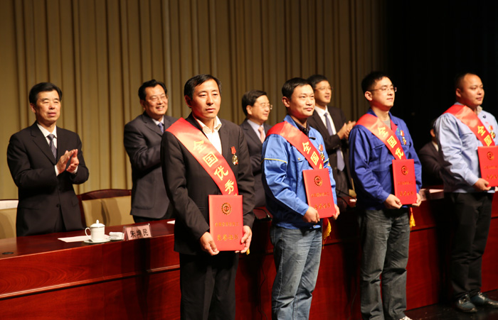錢衛(wèi)東(前排左二)被授予“全國優(yōu)秀農(nóng)民工”稱號