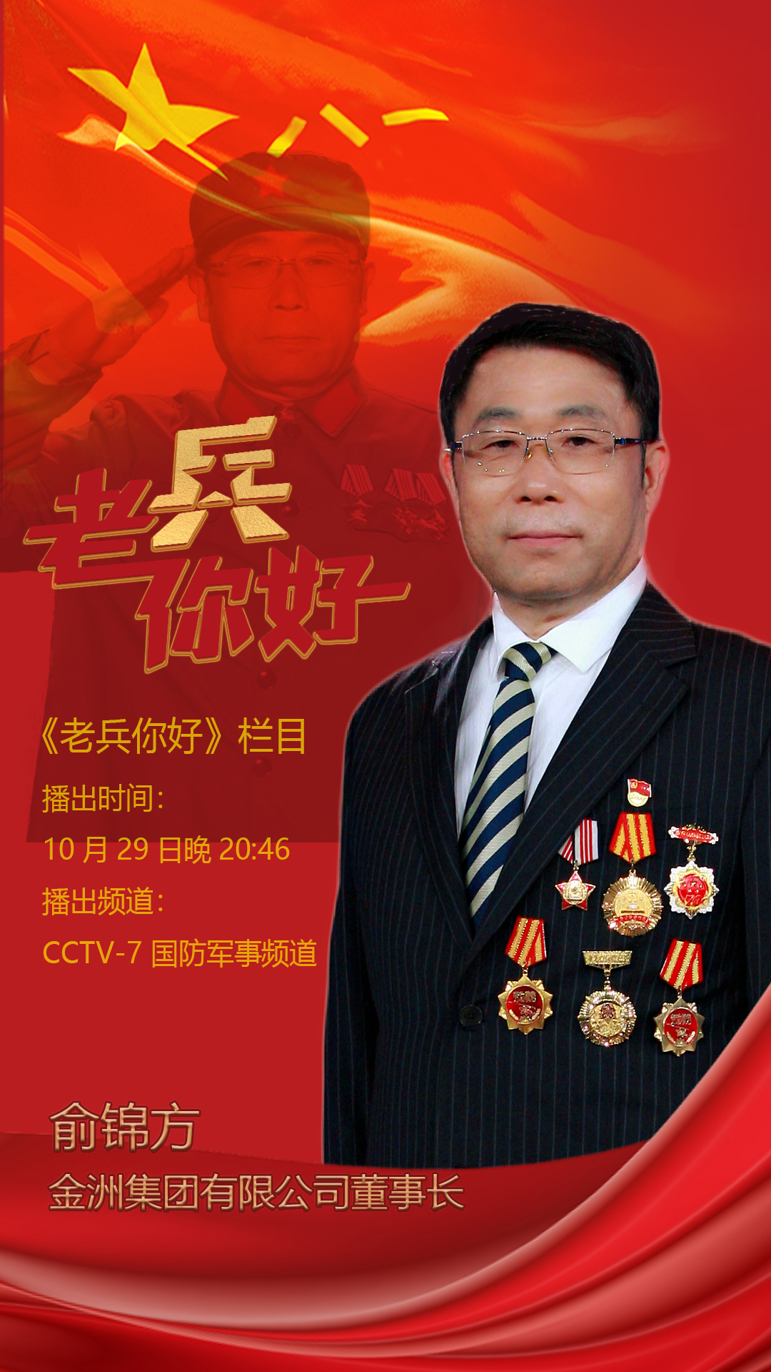 《老兵你好》二十大系列節(jié)目,將于10月29日晚20:46,在CCTV-7(國防軍事頻道)播出,為您深情講述全國最美退役軍人、金洲集團(tuán)董事長、浙江老兵俞錦方的奮進(jìn)故事,敬請收看!