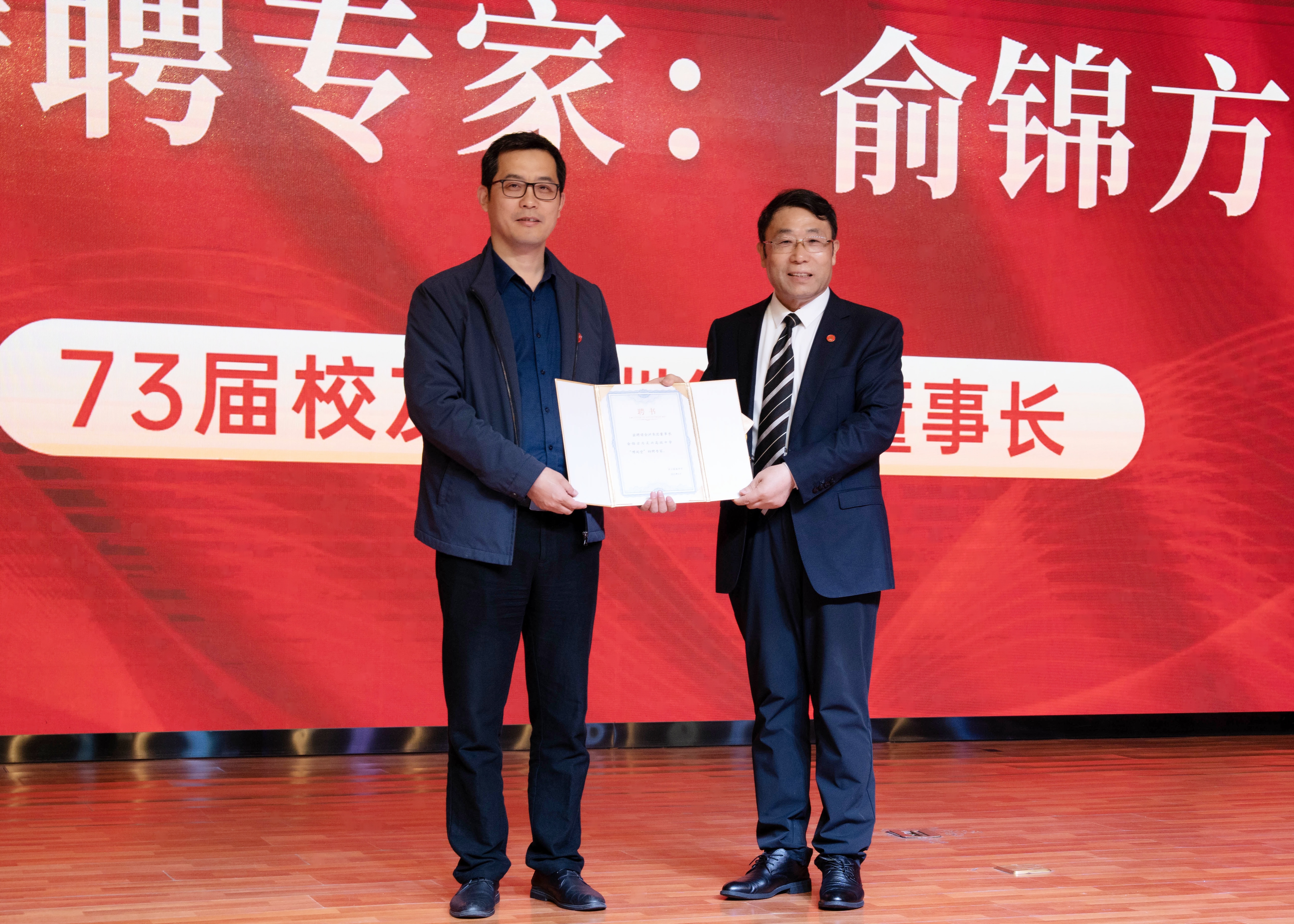 俞根強(qiáng)校長為俞錦方董事長頒發(fā)特聘證書